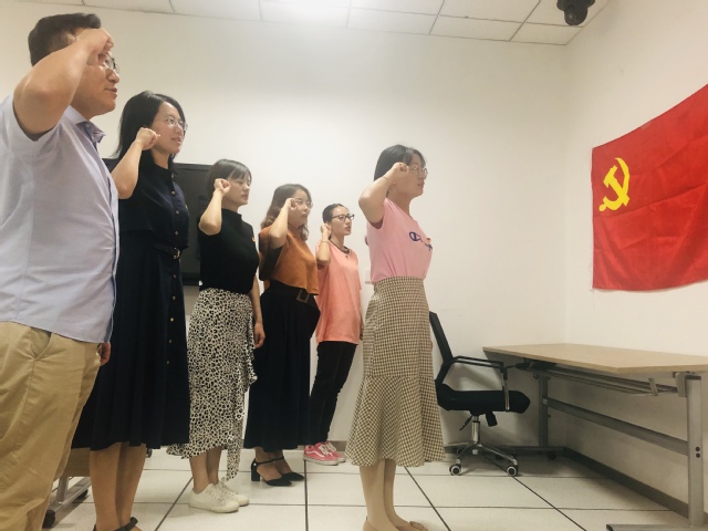 中午,党支部举行了“四重四亮”活动。首先各位党员重读入党志愿书,党支部成员赵春华同志做为具有十年党龄的党员,带头重读入党志愿书,重述入党情怀,牢记入党承诺。随后党支部全体成员重温入党誓词,面对鲜艳的党旗,胸前佩戴的党徽,支部成员无不动容。